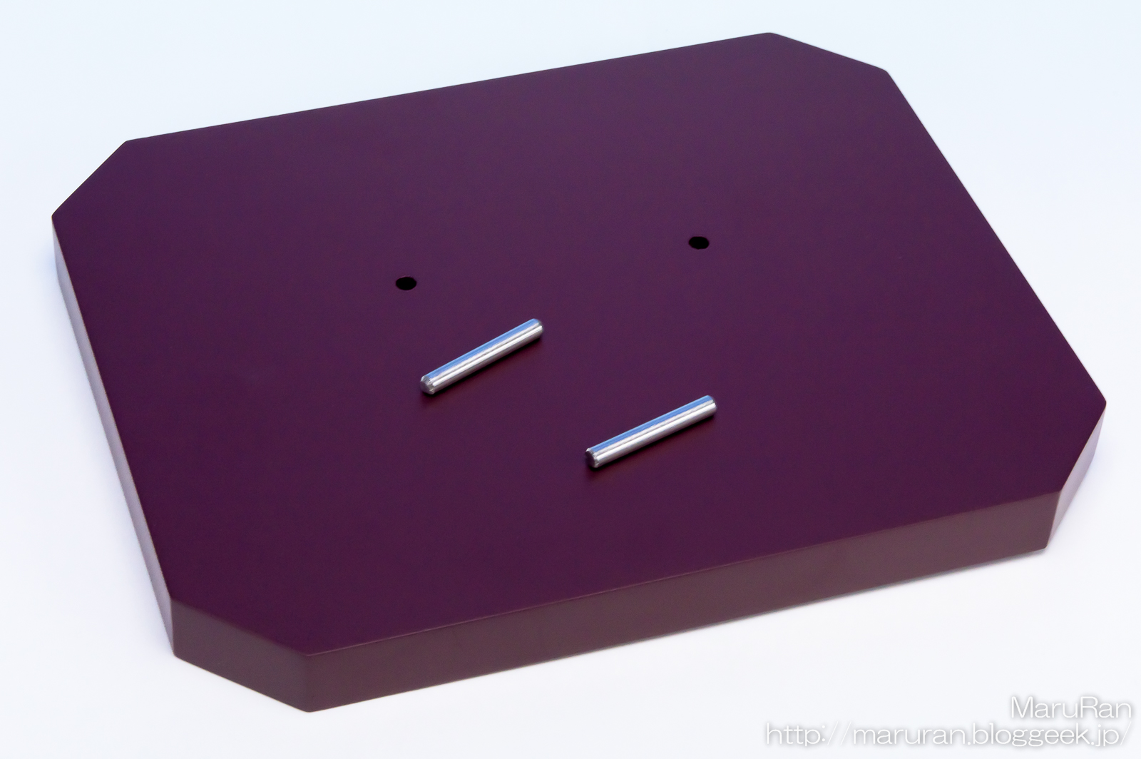 台座と金属ピン2つ。このピンを台座に挿し、踵のダボ穴と合わせて完成となる。